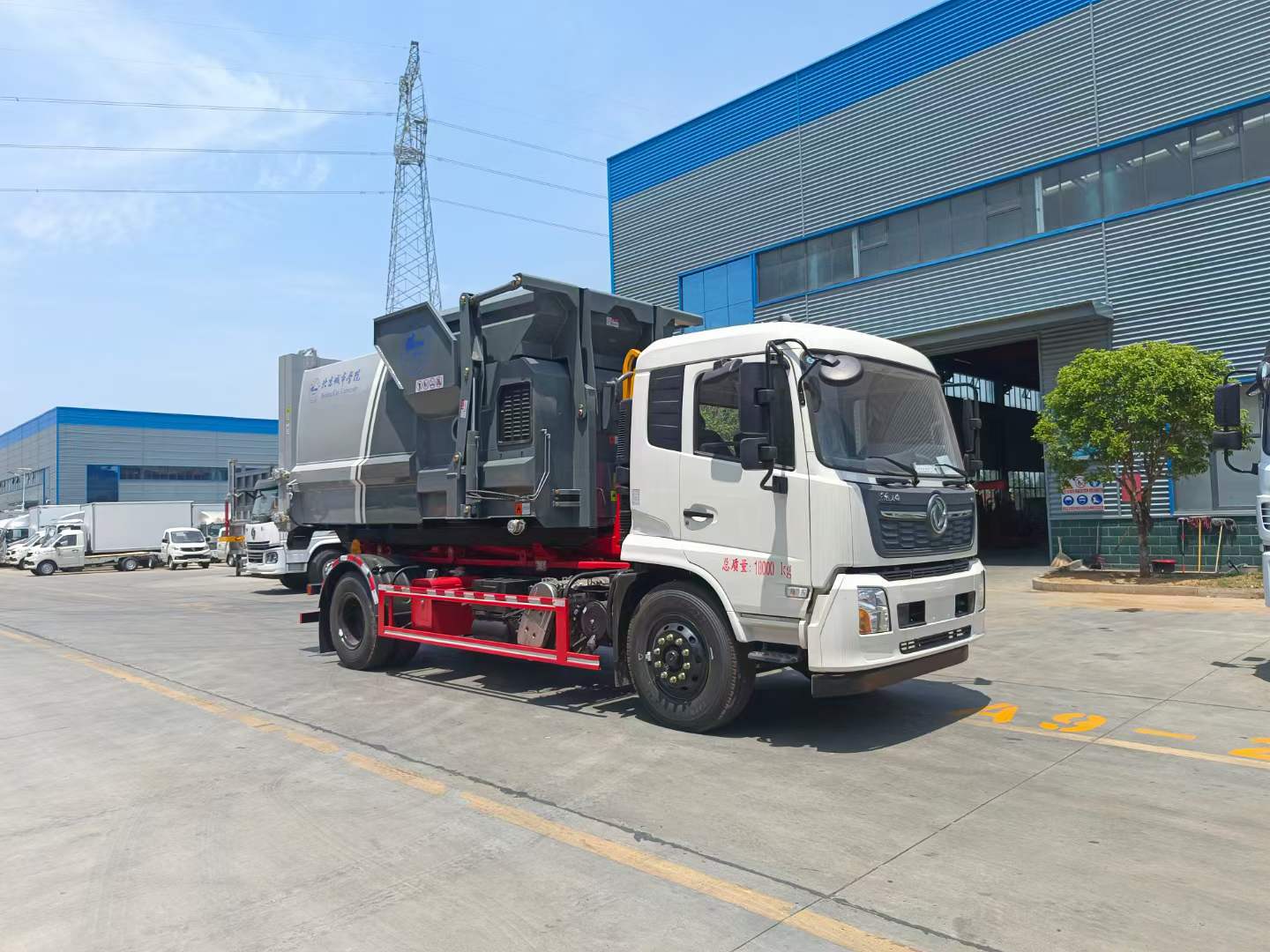 上装配置:配套12~14方勾臂垃圾箱,主勾臂由高强度板材制作,双油缸,国产多路阀,液压油泵,标配驾驶室外部操作,可选装驾驶室室内操作,选装液压后支腿,防误操作,带平衡阀,液压锁。